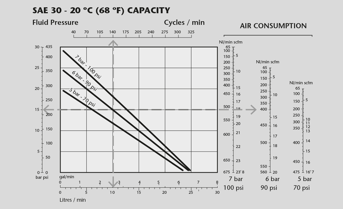 - Air consumption with 6 bar air inlet pressure and 10 l/min delivery.