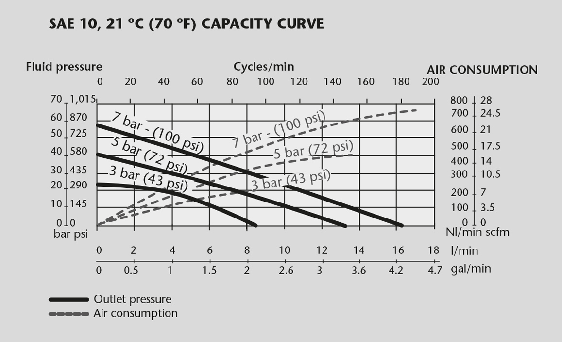 - Maximum air consumption with 5 psi (72 bar) air inlet pressure and 80 cpm.