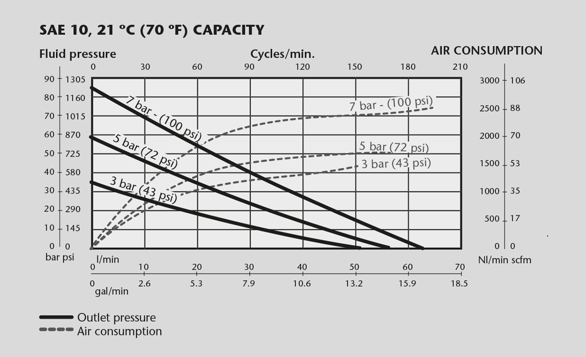 - Maximum air consumption with 5 bar air inlet pressure and 60 cycles/min.