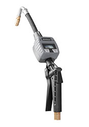 Oval gear hose end meter with electronic display for measured delivery of windshield washer, coolant and antifreeze solutions. Display is powered with two easy to replace 1,5 V AAA alkaline batteries. Meter can measure in litres, quarts, pints and US gallons. The meter is flange coupled delivery gun 186 300.